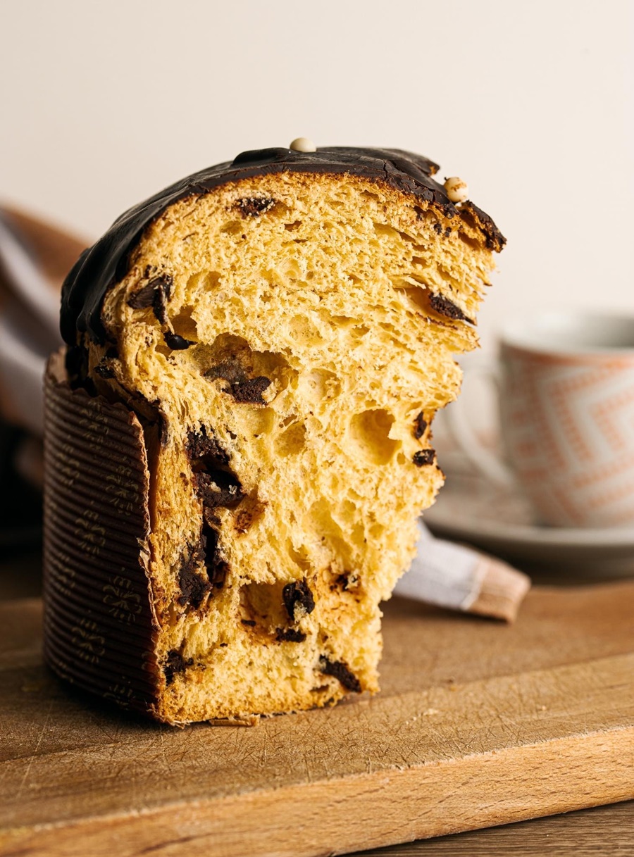 E’ preparata con un impasto a lunga lievitazione di circa 36 ore con farina di frumento, cacao, burro di latteria, uova, zucchero, gocce di cioccolato fondente, infine ricoperta da una golosa glassa al cioccolato fondente.